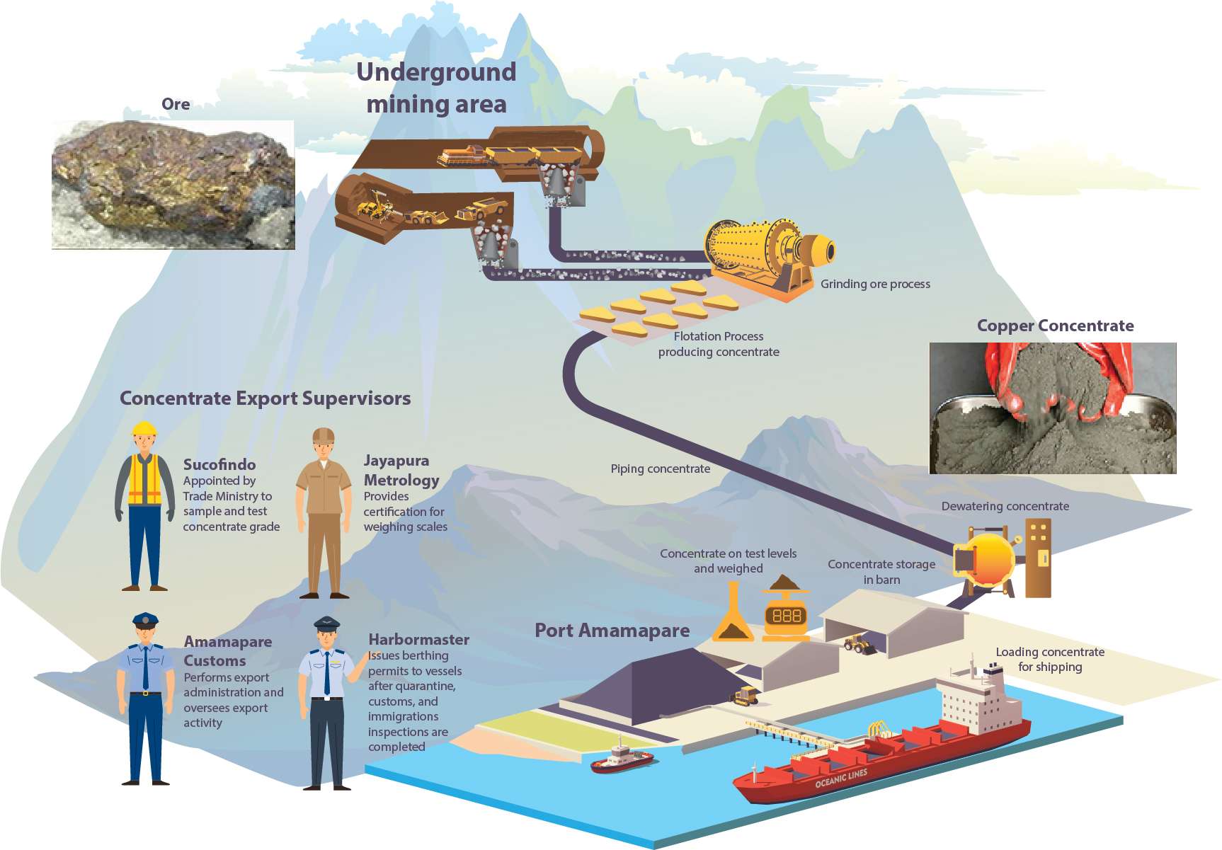 Pengolahan: meliputi tahapan penggerusan, pengapungan, dan pengeringan untuk menghasilkan Konsentrat tembaga, di mana pembeli melakukan pembayaran berdasarkan kandungan tembaga, emas, dan perak yang terdapat di dalamnya.