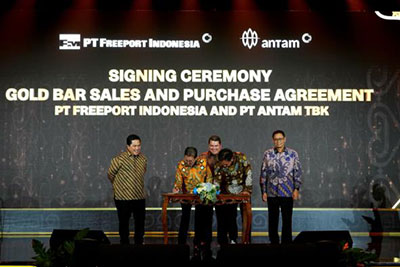 Presiden Direktur PT Freeport Indonesia (PTFI) Tony Wenas dan Direktur Utama PT Aneka Tambang Tbk (ANTAM) Nico Canter menandatangani perjanjian jual beli emas dengan kadar kemurnian 99,99 persen.