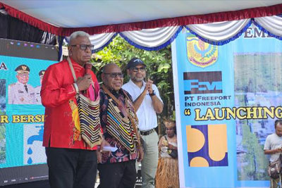 Bupati Mimika Johannes Rettob bersama Direktur & EVP Sustainable Development PT Freeport Indonesia Claus Wamafma meluncurkan program distribusi air bersih dari Water Treatment Plant (WTP) atau Fasilitas Pengolahan Air Bersih yang berada di Kuala Kencana.