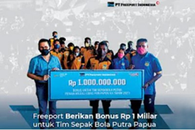 Baca Lebih LengkapPT Freeport Indonesia (PTFI) akan memberikan bonus sebesar Rp1 miliar untuk tim sepak bola Papua yang berhasil merebut medali emas Pekan Olahraga Nasional (PON) XX Papua. Hal itu disampaikan Direktur Utama PT Freeport Indonesia, Tony Wenas usai menonton partai final sepak bola putra PON XX, Kamis (14/10). Tim Papua meraih medali emas usai mengalahkan Aceh dengan skor 2-0.