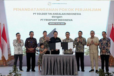 Presiden Direktur PT Freeport Indonesia (PTFI) Tony Wenas dan Direktur PT Solder Tin Andalan Indonesia (Stania) An Sudarno menandatangani Heads of Agreement (HoA) jual beli timbal dan perak yang dihasilkan dari fasilitas Precious Metal Refinery (PMR) PTFI.