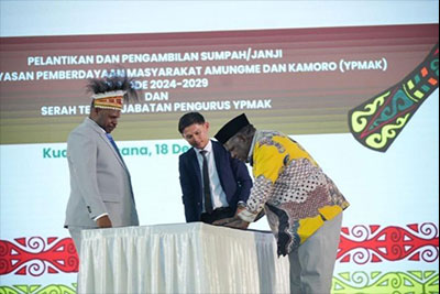 Pengurus Yayasan Pemberdayaan Masyarakat Amungme dan Kamoro (YPMAK) Periode 2024-2029 selaku pengelola dana kemitraan PT Freeport Indonesia (PTFI) resmi melakukan pengambilan sumpah dan janji pengurus di Gedung Multipurpose, Kuala Kencana, Rabu (18/12).