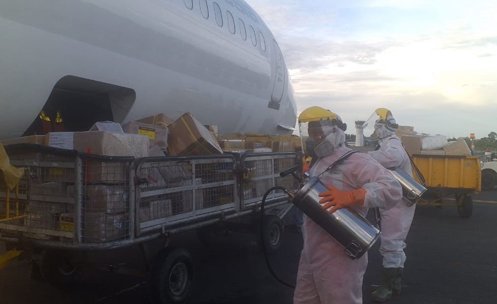 Proses Penyemprotan disinfektan pada kargo penerbangan pesawat Airfast Indonesia